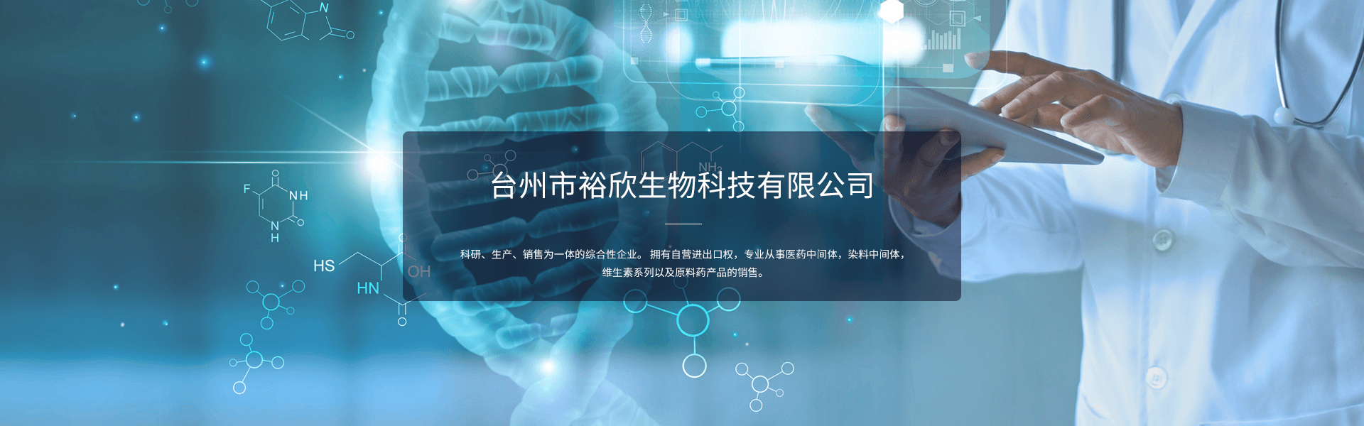 臺州市裕欣生物科技有限公司,位于浙江省臺州市,是集科研、生產、銷售為一體的綜合性企業。 擁有自營進出口權,專業從事醫藥中間體,染料中間體,維生素系列以及原料藥產品的銷售。 公司憑借強大的技術支持,良好的專業素養,經過努力發展現已同多個國家和地區的客商建立良好的合作關系.我們全體將始終不渝的依靠雄厚的技術力量和完善的管理體系,向廣大客戶提供高品質產品和完善的售后服務,秉承“用戶至上、精益求精、誠信合作”的經營思想,繼續與國內外各界新老朋友一起,建立良好的合作關系,共同創造美好美...